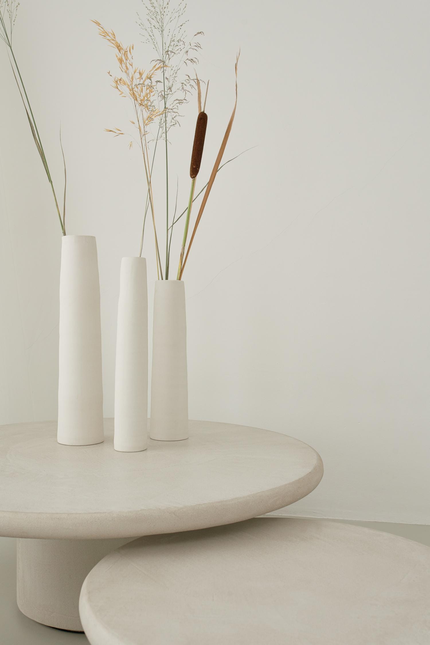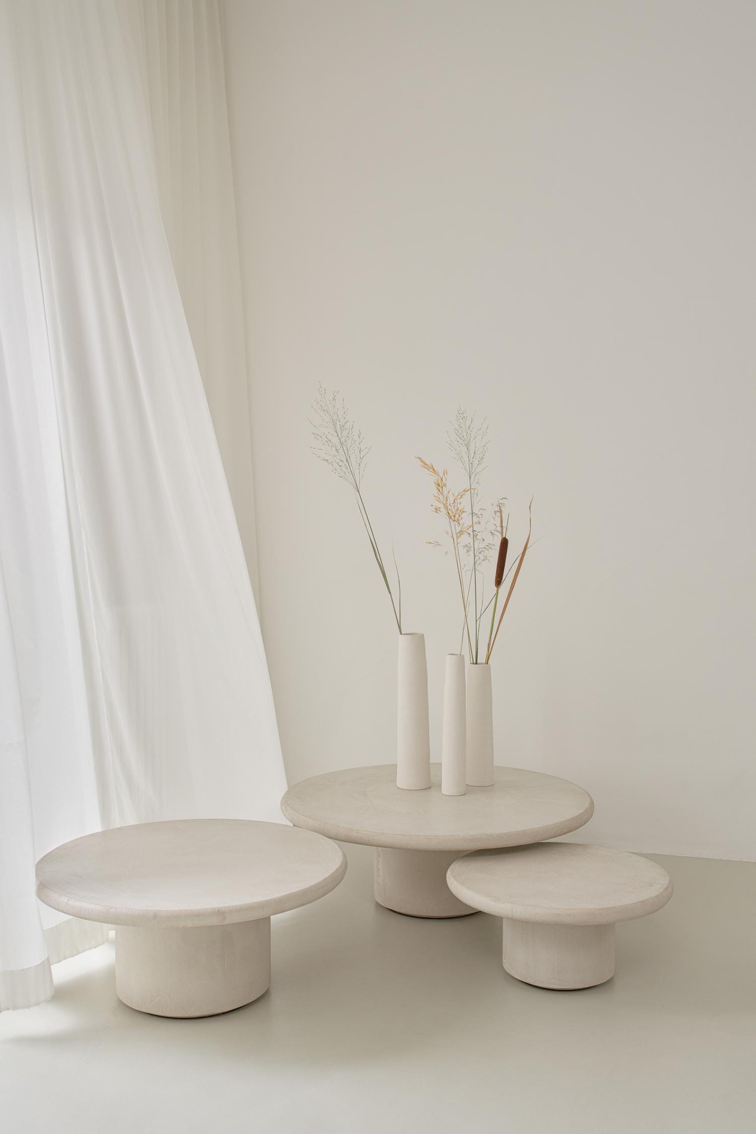 De karaktervolle Mushroom salontafels zijn uitgevoerd in ongeverfd stuc — een nieuw materiaal voor Duran. Stuc heeft een rijke geschiedenis in sierlijke architecturale reliëfs. In samenwerking met lokale specialisten ontwikkelen en brengen we een unieke receptuur aan. De textuurverschillen op elk oppervlak zijn uniek en vertellen het verhaal van het handgemaakte — een essentieel aspect van elk product.