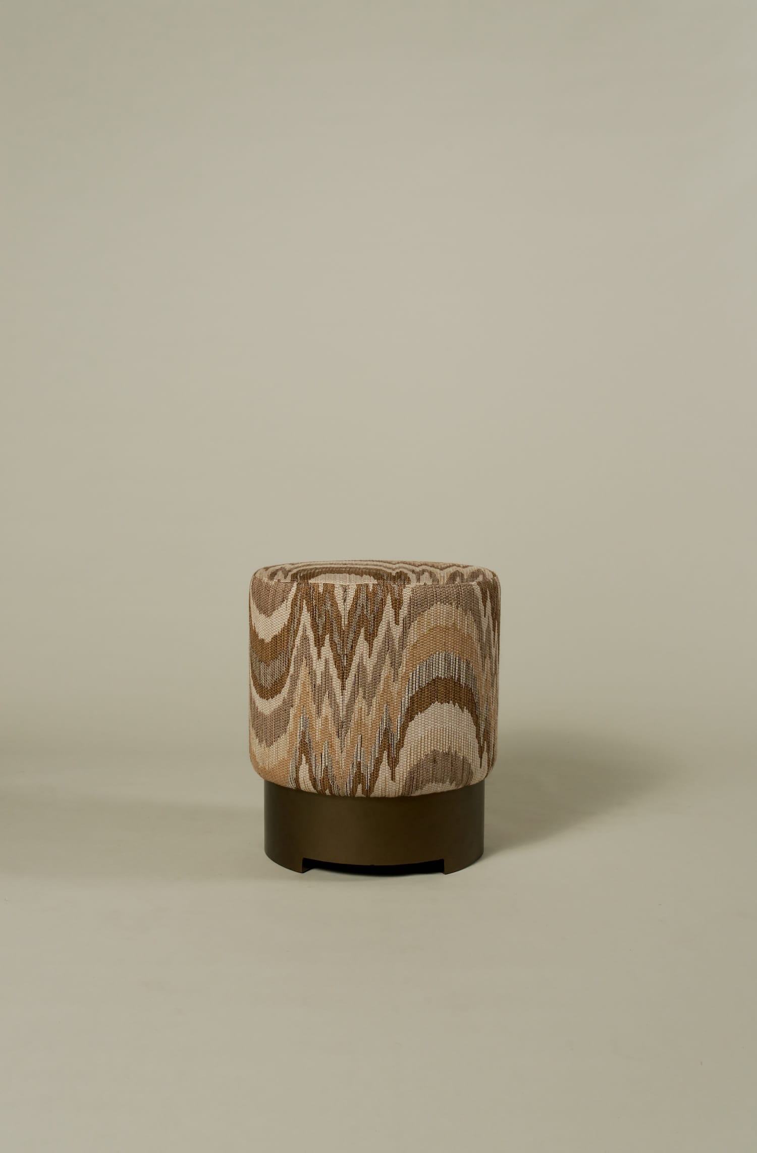 The Taburetta pouf features a sleek metal base available in three colors—black, new bronze, or beige—and can be upholstered in a wide selection of Duran fabrics or your own fabric. Its playful design makes it an ideal accent piece for the living room or placed next to a dining table, adding both style and functionality to your space.